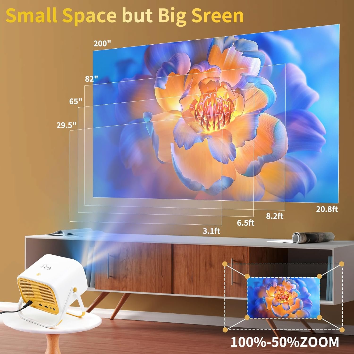 • 【1080P Supported & 15000 Lux & Max 200”& Zoom】This movie projector with 720P Full HD Native and 1080P support faithfully reproduces real color content. It also features a brightness of 500 ANSI and 15,000 Lux brightness, ensuring vivid and vibrant imagery. It delivers stunning picture quality from 30 to 200 inches within 3 to 21 feet. Additionally, enjoy customizable viewing with a 50% to 100% zoom capability. Whether you’re in a cozy attic, bedroom, RV, or a larger space, this mini projector seamlessly adapts to your environment.
