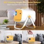 • 【360° Built-in Stand & One-Hand Control】This smart projector features a 360° rotatable design, making it easy to adjust for the perfect viewing angle with its stable triangular stand. Effortlessly point the tilting projector in various directions, including the ceiling and the ground. Imagine lying in bed and watching a movie projected on your bedroom ceiling. Whether enjoying a movie night indoors or outdoors, this portable projector ensures a high-quality visual experience anywhere you go.